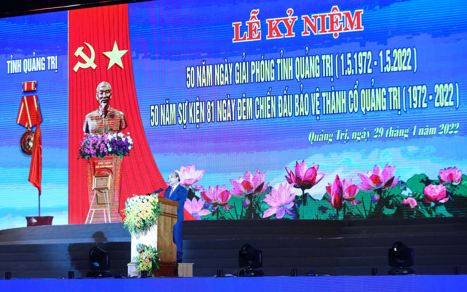 Đến với Quảng Trị hôm nay, 50 năm sau ngày giải phóng, chúng ta chứng kiến sự đổi thay, vươn lên mạnh mẽ với một sức sống mới, khí thế mới. Quảng Trị đã viết nên câu chuyện cổ tích mà có thật về “thép nở hoa”. Sự hồi sinh thật khó hình dung từ một vùng đất bom cày đạn sới, nay từ diện mạo kinh tế đến đời sống xã hội tỉnh Quảng Trị không ngừng phát triển, thu nhập và mức sống người dân ngày càng được nâng lên rõ rệt. Ghi nhận những thành quả đã đạt được, Đảng và Nhà nước đã trao tặng cho tỉnh nhiều phần thưởng cao quý. Đặc biệt, trong ngày vui hôm nay, tỉnh Quảng Trị vinh dự lần thứ 2 được đón nhận Huân chương Hồ Chí Minh. Thay mặt lãnh đạo Đảng, Nhà nước, tôi xin nhiệt liệt biểu dương và chúc mừng những thành tựu to lớn mà Đảng bộ, chính quyền và nhân dân tỉnh Quảng Trị đã giành được trong suốt 50 năm qua.