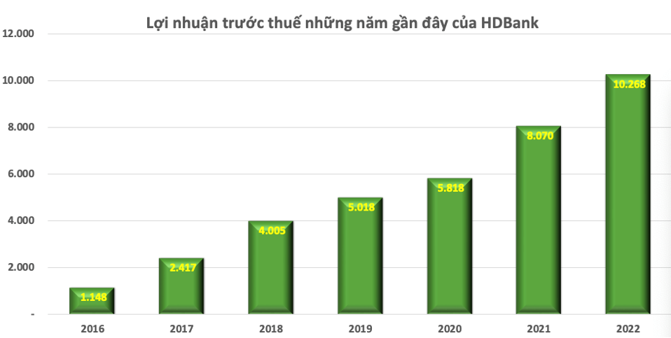 Về hiệu quả kinh doanh, năm 2022 HDBank ghi dấu ấn lần đầu tiên vào “Câu lạc bộ 10.000 tỷ đồng” khi đạt tới 10.268 tỷ đồng lợi nhuận trước thuế, tăng 27,2% so với cùng kỳ. Tổng tài sản cũng gia tăng nhanh chóng, vượt 416.200 tỷ đồng.