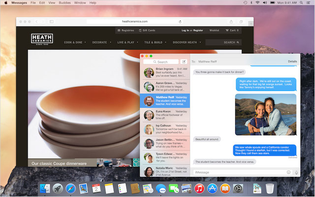 Với Yosemite, Apple cũng đã tạo ra những kiểu tương tác hữu ích giữa hệ điều hành này với iOS, giúp người dùng có được một trải nghiệm thống nhất hơn. Chẳng hạn như, trên Yosemite, bạn có thể tạm dừng 1 tác vụ nào đó trên Mac, rồi sau đó có thể thực hiện tiếp tác vụ này trên iPad, iPhone. Bạn cũng có thể gọi điện, nhận và gửi tin nhắn ngay từ màn hình của Mac mà không cần cầm tới iPhone. Trong khi đó ở chiều ngược lại, bạn có thể tận dụng 3G của điện thoại để làm điểm phát WiFi cho Mac của mình. Ngay bây giờ, người dùng Mac có thể tải về để nâng cấp Yosemite tại đây.