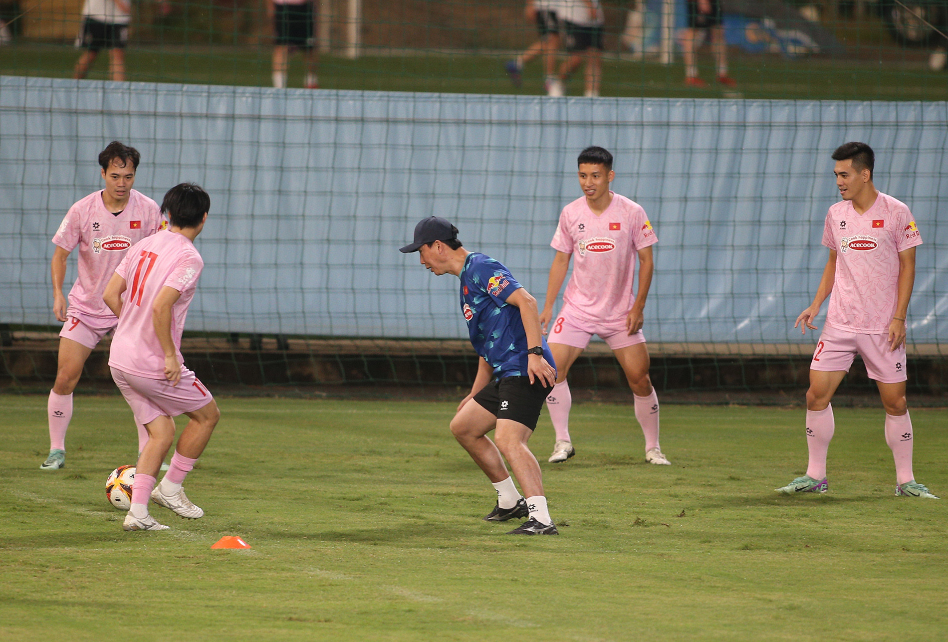 Chiều 4/6, tuyển Việt Nam có buổi tập thứ 4 chuẩn bị cho hai trận gặp Philippines và Iraq, trong khuôn khổ vòng loại thứ 2 World Cup 2026 khu vực châu Á.Sau 4 buổi tập, HLV Kim Sang Sik hiểu rõ hơn về các cầu thủ Việt Nam. Chiến lược gia người Hàn Quốc thường xuyên có những bàn bạc với trợ lý về vấn đề nhân sự.Cũng như các buổi tập trước đó, tuyển Việt Nam khởi động với những bài tập vui nhộn giúp bầu không khí trở nên rất thoải mái, hứng khởi.Tiếng cười xuất hiện trong suốt buổi tập của tuyển Việt Nam.Văn Thanh là một trong những trụ cột dưới thời HLV Park Hang Seo, được dự đoán có suất đá chính khi HLV Kim Sang Sik dẫn dắt.Đáng chú ý trong buổi tập chiều 4/6, những cầu thủ được cho là đá chính trong trận tiếp đón Philippines thường xuyên tập chung nhóm với nhau. Đó là Quang Hải, Duy Mạnh, Tuấn Tài, Tuấn Anh, Hoàng Đức, Tuấn Hải, Văn Toàn, Tiến Linh...Trong khi đó, cuộc chiến ở khung gỗ tuyển Việt Nam chắc chắn là hai cái tên Nguyễn Filip và Đặng Văn Lâm.Tuyển Việt Nam chỉ có 5 ngày chuẩn bị cho trận gặp Philippines, tuy nhiên các cầu thủ ở đợt tập trung lần này đều có nhiều kinh nghiệm.HLV Kim Sang Sik thường xuyên tập cùng các học trò.Ngày 5/6, HLV Kim chốt danh sách tuyển Việt Nam với 23 cầu thủ, vì vậy có 4 cái tên bị loại trước trận gặp Philippines.HLV Kim Sang Sik được dự đoán sử dụng nhiều gương mặt quen thuộc ở tuyển Việt Nam.