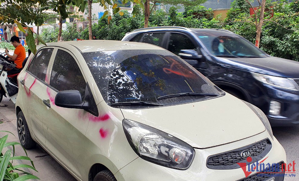 Theo quan sát, có 4 ô tô bị xịt sơn lên thân xe. Các xe này dường như đã đỗ rất lâu chưa di chuyển vì trên thân xe có nhiều bụi đất, lá cây bao phủ.