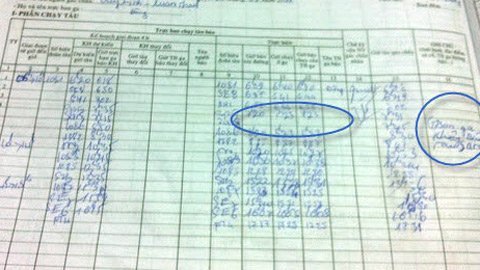 | Nhật ký chắn đường của nhân viên gác chắn Tô Ngọc Vân để trống ô giờ báo xin đường và giờ báo chạy, đồng thời ghi nhận sự cố do trực ban ga không báo. |