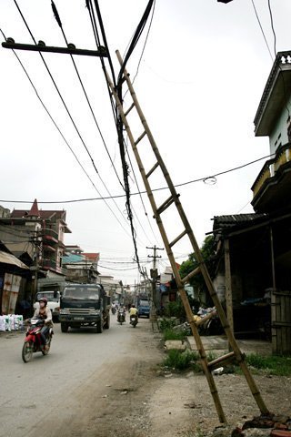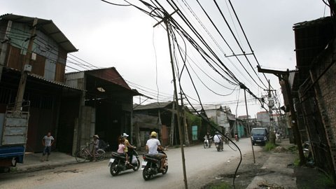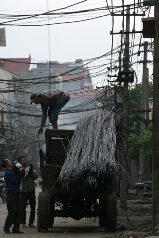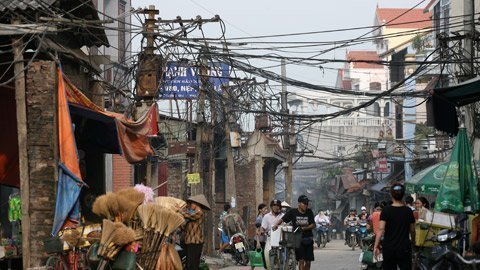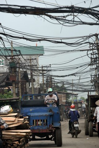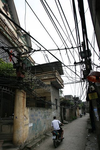 Dây điện từng búi chạy ngang dọc trên đầu người khắp đường làng, ngõ xóm, chạy loằng ngoằng trên tường, lòng thòng xuống đất là những hình ảnh có thực tại ngôi làng sản xuất thép thuộc hàng lớn nhất miền bắc.