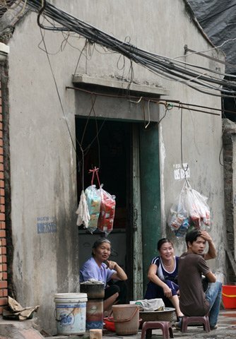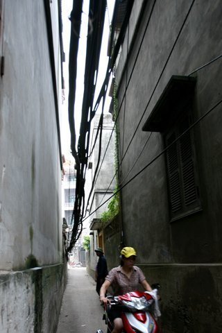 Một con ngõ với dày đặc dây điện như mạng nhện võng xuống sát đầu người.