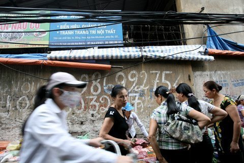 Người dân thản nhiên họp chợ với những sợi dây điện sà sát đầu.