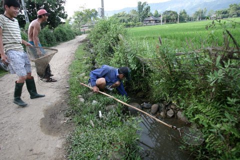 Chiều chiều, những thanh niên ở bản Noong Ỏ (Xã Phù Nham, Văn Chấn, Yên Bái) săn bắt cá, trạch, lươn từ những mương, lạch nước chảy quanh bản.