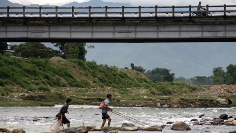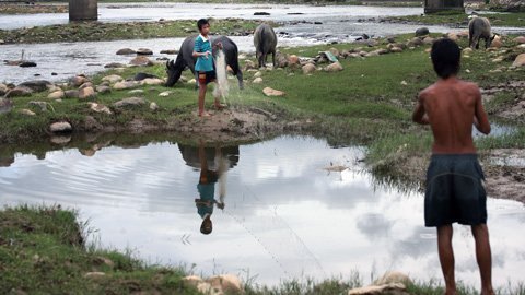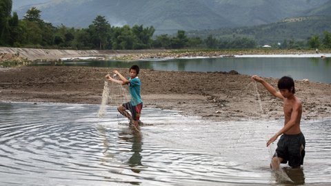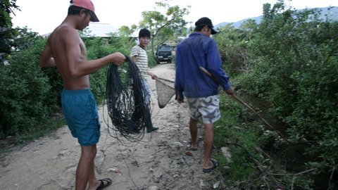 Những cậu bé ở tuổi thiếu niên bắt cá bằng cách giăng những tấm lưới mắt nhỏ mà đến cá bé bằng ngón tay út cũng không thoát nổi nếu mắc lưới.