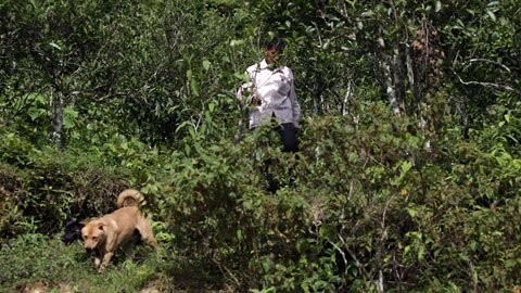 Cùng với những con chó rất thính nhạy, những người đàn ông H’ Mông ở xã Phình Hồ (Văn Chấn) đang tìm bắt rắn ở một sườn núi rậm rạp cây cối.