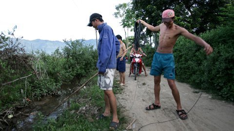 Điều đặc biệt là những thanh niên này dùng điện lưới dòng từ nhà với cuộn dây điện dài hàng trăm mét đi quanh bản săn bắt cá.