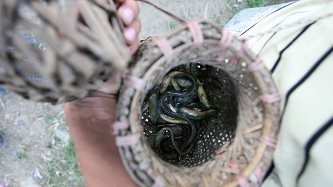 Từ nhiều năm nay người dân sử dụng kiểu săn bắt bằng điện lưới nên lượng cá, lươn trạch còn rất ít và thường chỉ bé bằng ngón tay đã bị săn bắt. Trong ảnh là toàn bộ số cá, lươn, trạch mà 3 thanh niên thu hoạch được sau một buổi chiều.