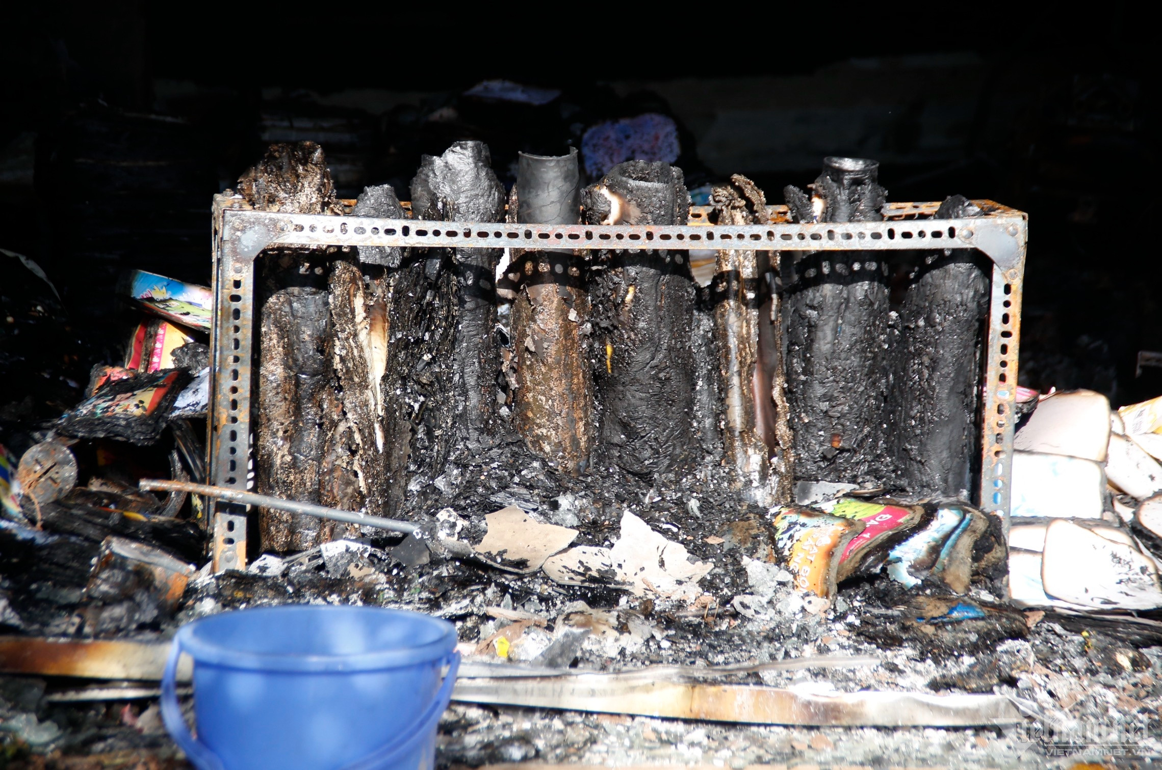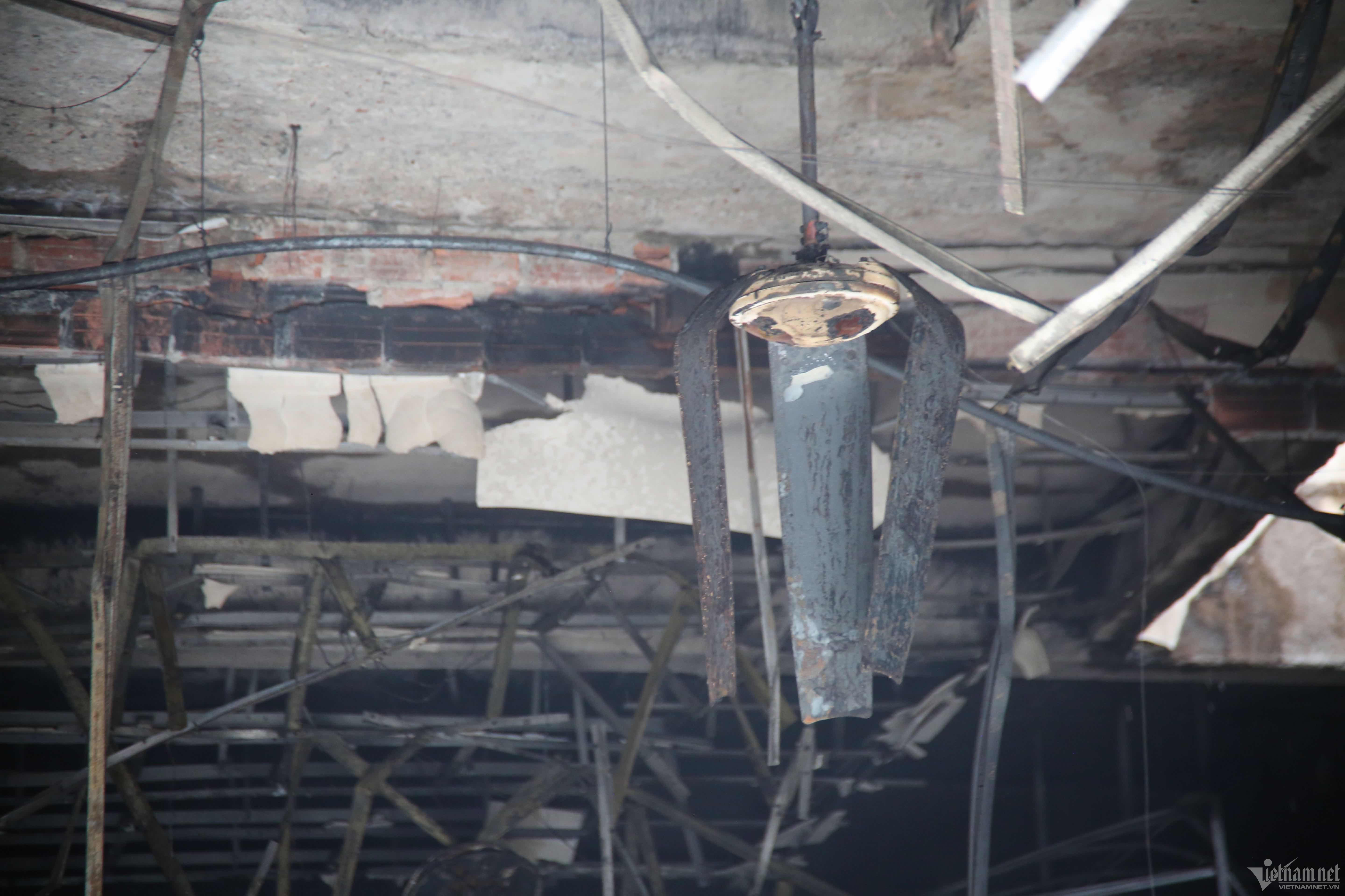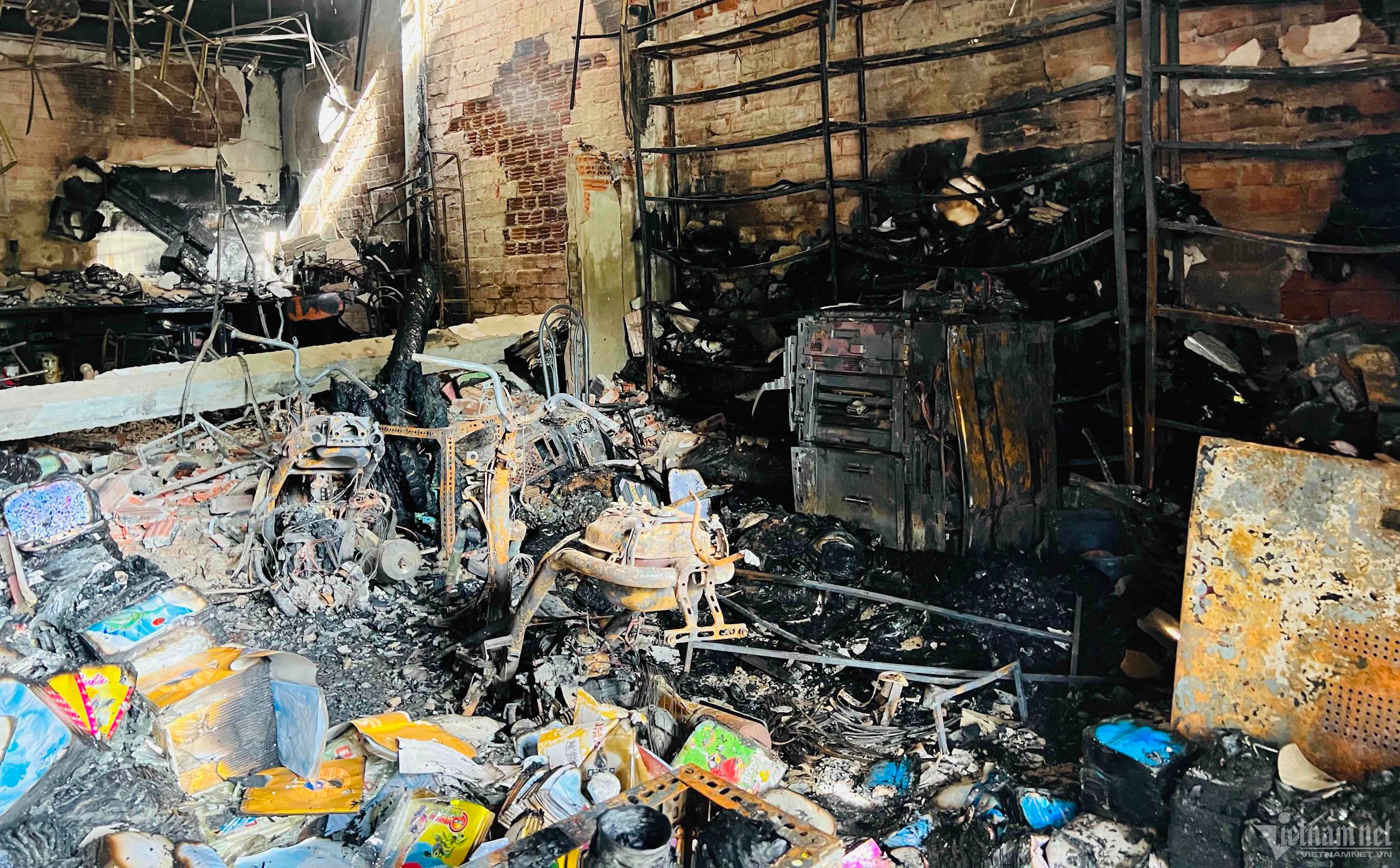 Hiện trường vụ cháy ngổn ngang, nhiều thiết bị, văn hóa phẩm bị thiêu rụi.