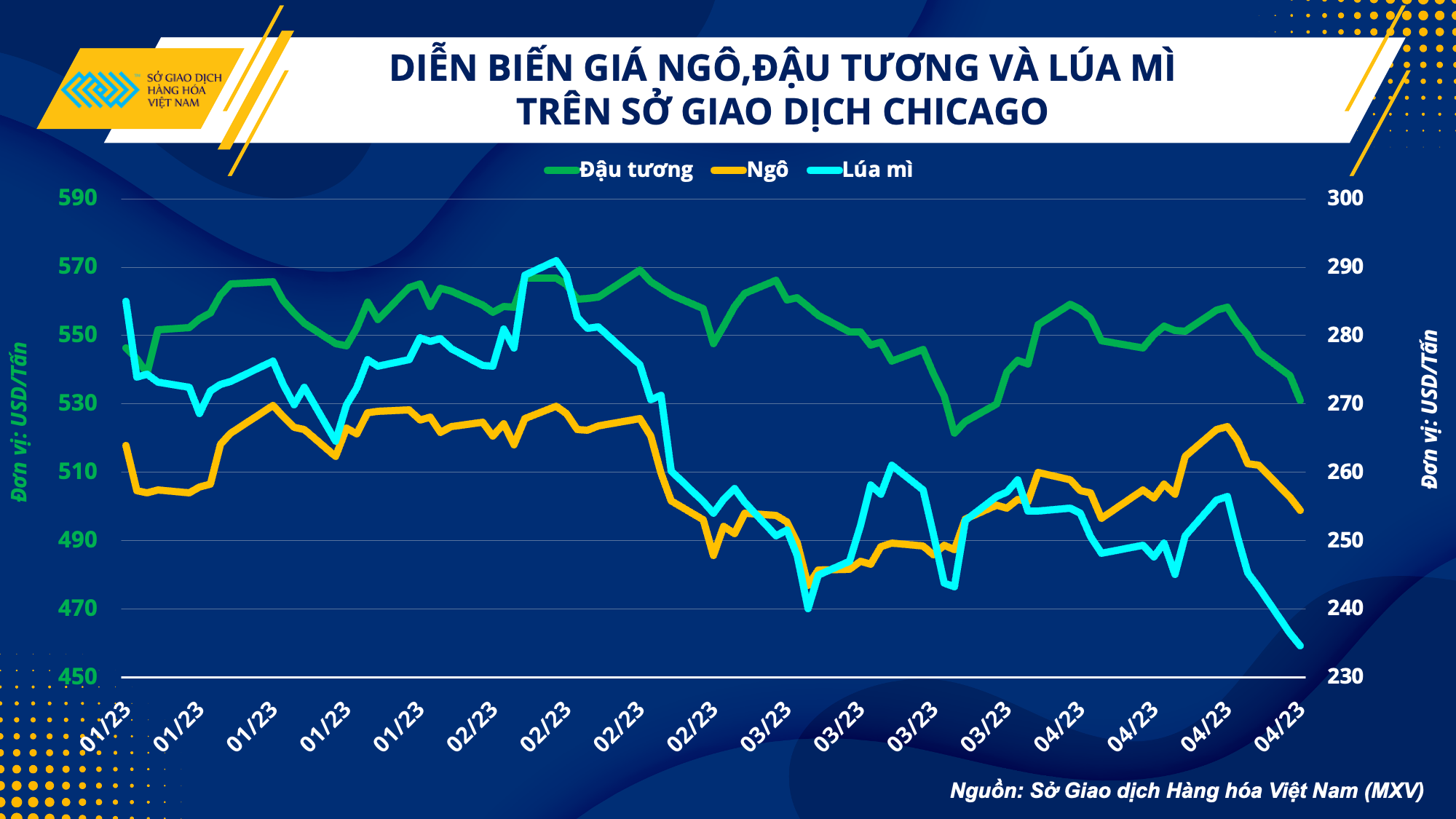 Số liệu từ Sở Giao dịch Hàng hóa Việt Nam (MXV) cho thấy, giá các mặt hàng nông sản thế giới đã liên tục hạ nhiệt kể từ giữa năm ngoái. Bên cạnh đó, việc mô hình thời tiết El Nino quay trở lại được dự báo sẽ có tác động đáng kể đối với nguồn nguyên liệu đầu vào của các doanh nghiệp sản xuất thức ăn chăn nuôi nội địa.