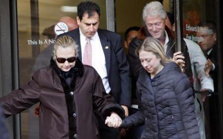 Đi cùng Hillary là chồng bà, cựu tổng thống Bill Clinton và con gái, Chelsea Clinton cùng một số phụ tá.