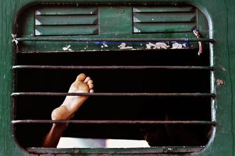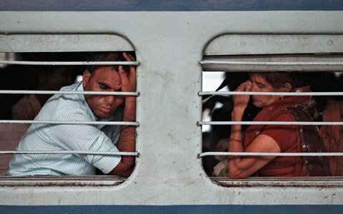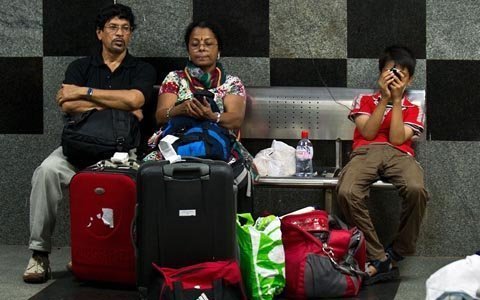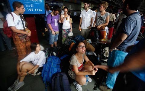 Du khách nước ngoài bị mắc kẹt đang đợi tàu tại một nhà ga ở New Delhi. (Ảnh: AP)