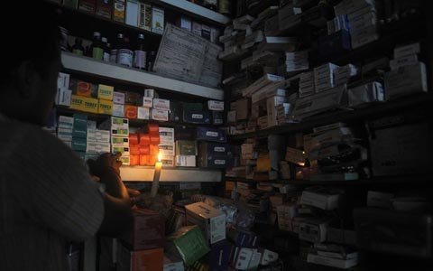 Một dược sĩ cầm cây nến khi đang tìm thuốc cho khách hàng tại cửa hiệu ở Siliguri. (Ảnh: Getty Images)