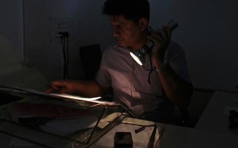 Một nhân viên văn phòng tại Changdigarh, phía bắc Ấn Độ đọc tài liệu với sự hỗ trợ của một chiếc đèn pin. (Ảnh: Reuters)