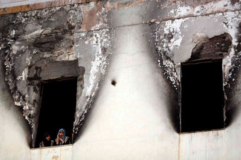 Từ một tòa nhà bị phá hủy ở trung tâm Benghazi, các chị em đứng xem một đoàn