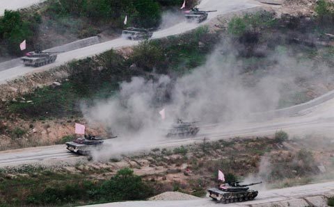 Các xe tăng của quân đội Hàn Quốc di chuyển trong một cuộc tập bắn đạn thật ở