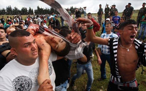 Người biểu tình Palestine vác một bé trai bị thương khi lính Israel nổ súng vào một đám đông ở Maroun al-Ras, Lebanon. Quân đội Israel đã khai hỏa khi đông đảo người biểu tình kéo tới biên giới Israel; 4 người thiệt mạng. (Ảnh: AP)