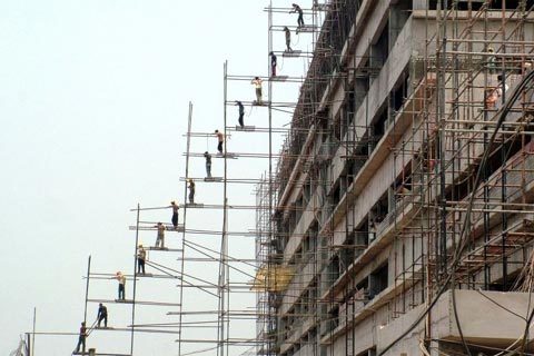 Các lao động làm việc tại công trường xây dựng một tổ hợp thương mại ở thành phố Bhubaneswar, đông Ấn Độ.