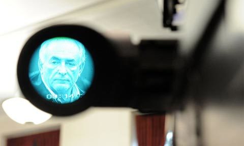 Cựu Tổng giám đốc Quỹ Tiền tệ quốc tế (IMF) Dominique Strauss-Kahn, nhìn qua một máy quay, đứng trước thẩm phán Melissa Jackson ở Tòa hình sự Manhattan khi ông bị buộc tội tấn công tình dục ở thành phố New York. Strauss-Kahn bị cảnh sát New York bắt giam ngày 14/5 sau khi ông lên máy bay chuẩn bị về Paris. (Ảnh: Getty)