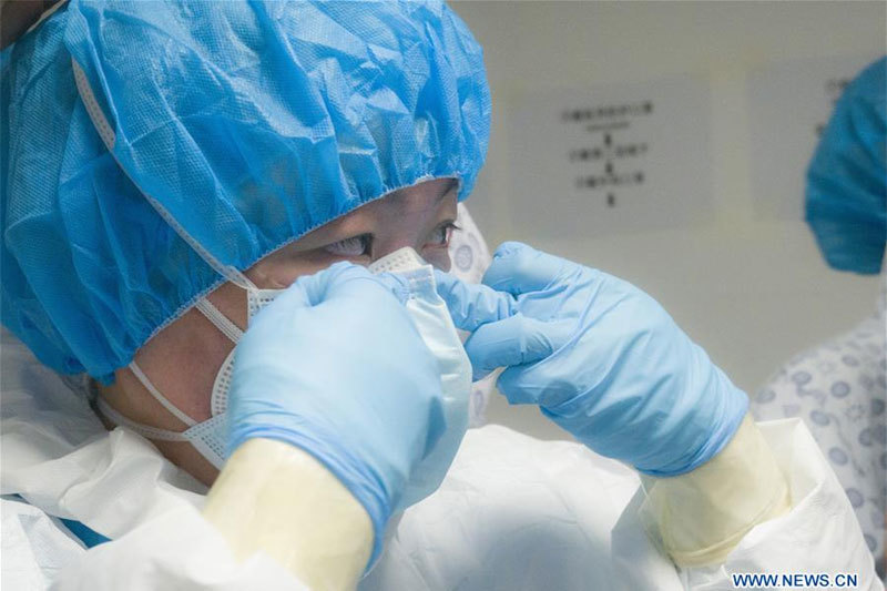 Một nhân viên y tế tự kiểm tra khẩu trang ở khu vực Guanggu thuộc bệnh viện Tongji ở Vũ Hán. |