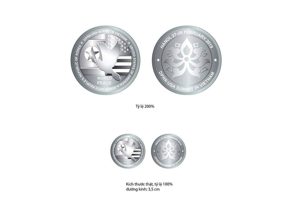 Đồng xu bạc có đường kính 3,5cm, một mặt in hình con chim bồ câu biểu tượng của Hòa bình Thế giới và quốc kỳ của 3 nước Mỹ, Triều Tiên và Việt Nam. Một mặt là hình hoa sen của Việt Nam và ghi ngày, tháng đánh dấu Hội nghị thượng đỉnh mang tính lịch sử này. Trọn bộ gồm có 1 đồng xu bạc, 1 hộp đựng quà cao cấp có in kèm giấy chứng nhận phát hành vật phẩm lưu niệm do Giám đốc công ty Tem Việt Nam ký tên và đóng dấu.