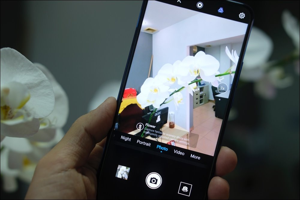 Camera này hỗ trợ trí tuệ nhân tạo, có thể nhận diện khung cảnh, như trong hình - máy nhận diện đang chụp hoa, từ đó sẽ tối ưu màu sắc, độ chi tiết, độ tương phản... để giúp ảnh đẹp hơn. |