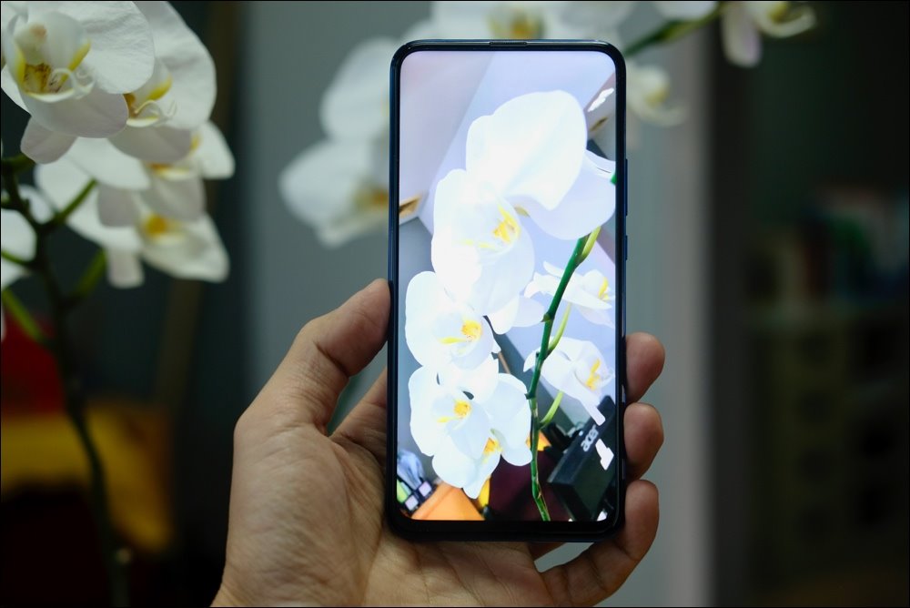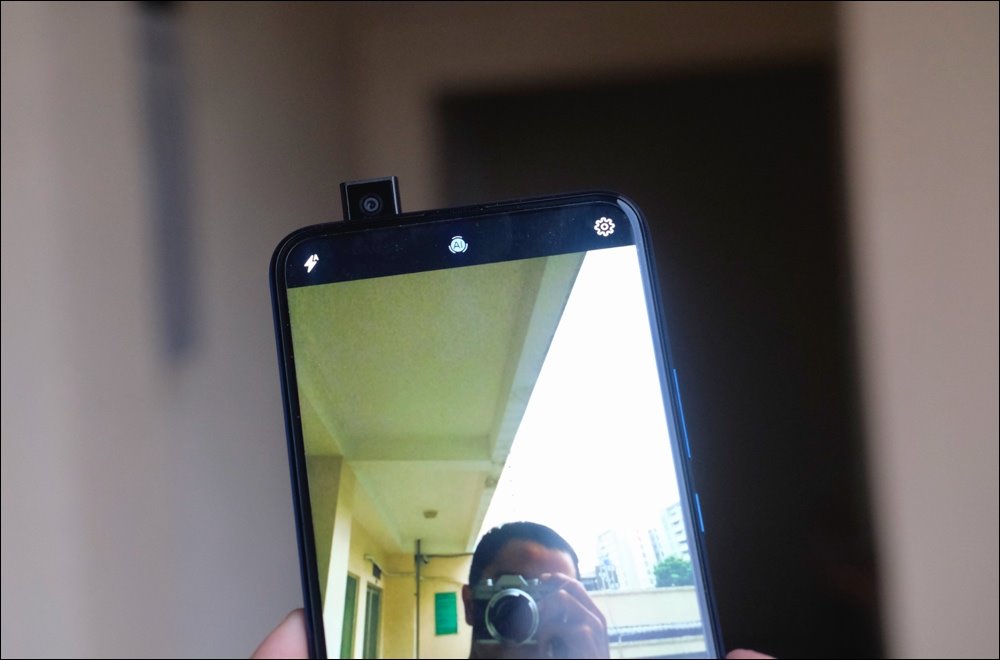 Để có được màn hình này, camera selfie của máy được giấu kín bên trong thân máy, chỉ trượt lên khi cần chụp ảnh selfie. Camera này có độ phân giải 16MP. |