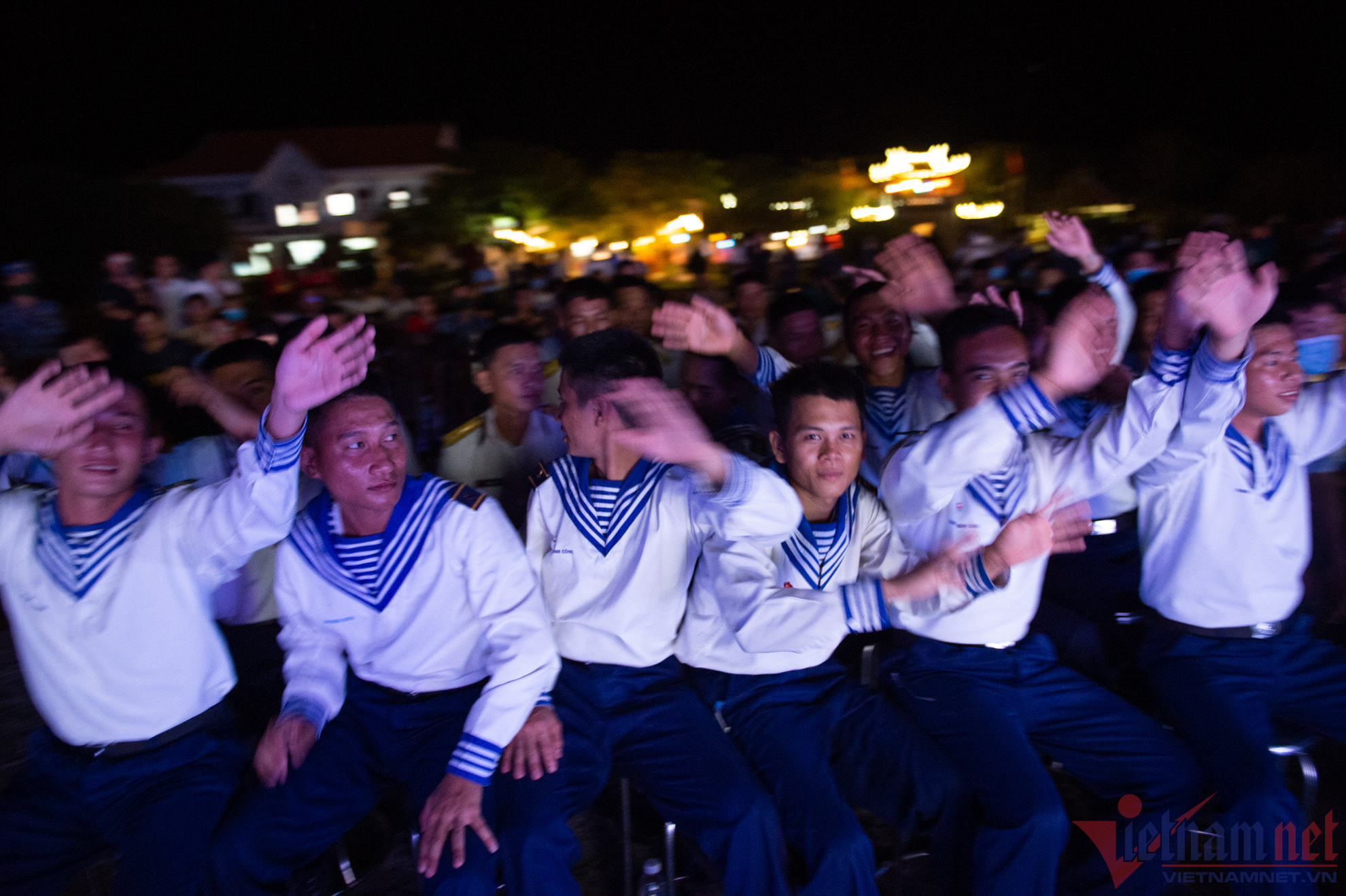 Chiến sĩ Lê Công Đại trên đảo Cô Lin cười tươi khi có đoàn đến thăm. Đại được đơn vị cho phép tạm dừng nhiệm vụ canh gác để giao lưu với đoàn văn công.