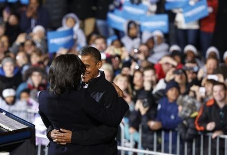 Tổng thống Barack Obama ôm phu nhân Michelle Obama trước khi ông có bài phát biểu trước các cử tri ủng hộ vào ngày cuối cùng trước khi bước vào ngày bỏ phiếu chính thứ tại Des Moines, bang Iowa. Tại đây ông Obama đã không kìm được nước mắt khi kể về một câu chuyện cũ từ dịp tranh cử năm 2008.