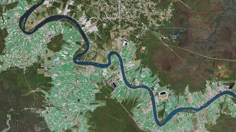 Khung cảnh nhìn từ trên cao, một con sông chảy uốn lượn ở Los Angeles, các ngôi nhà và nông trại mọc lên hai bên bờ sông. |