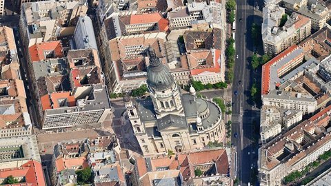 Một hình ảnh chụp nghiêng tại Budapest, Hungary. Nhà thờ trung tâm làm cho các con phố trông có vẻ nhỏ hơn. |