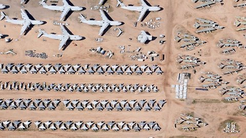 Một loạt các máy bay xếp hàng dài trên vùng đất khô và bụi ở bang Arizona |