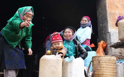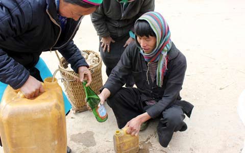 | Rượu ngô ủ bằng men lá là thứ hàng hoá không thể thiếu mỗi khi phiên chợ họp. |