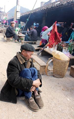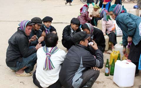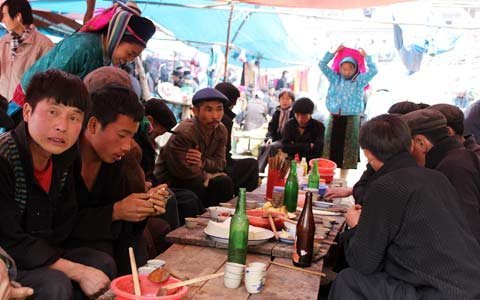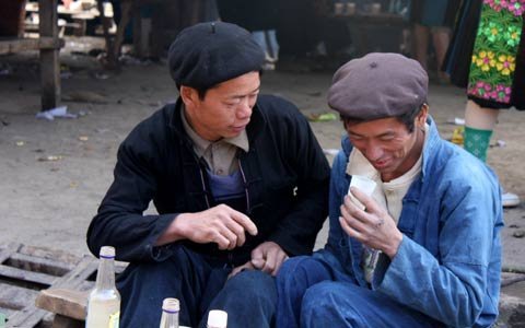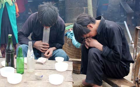 | Đàn ông người Mông vẫn nổi tiếng với “đô cao”. Nhiều người đến với phiên chợ chỉ để uống rượu, tiêu tiền sau những ngày vất vả làm ăn. |