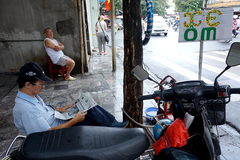 | Người đàn ông hành nghề xe ôm trên phố Hàng Gai đọc tin tức qua một tờ báo in trong lúc chờ khách. |