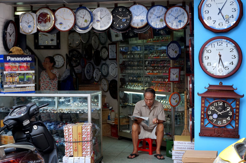 | Chủ cửa hiệu kinh doanh đồng hồ trên phố Cầu Đông đọc báo sáng. |