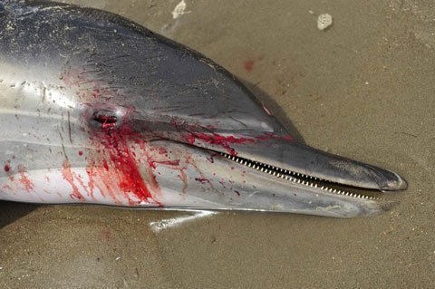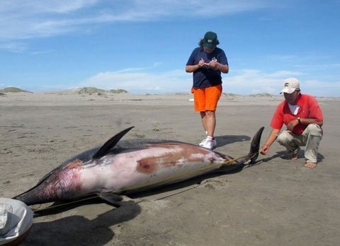 Khoảng 95% trong số 877 con cá heo chết được xác được là loài cá heo mũi chai Tursiops truncatus. Trong ảnh là xác một con cá heo tại một bãi biển phía bắc Peru, cách thủ đô Lima khoảng 750 km về phía bắc Ảnh chụp hôm 11/4.