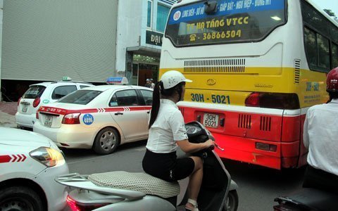 | Taxi, xe buýt và xe ô tô cá nhân dàn hàng ngang, lấn hết phần đường dành cho xe máy trên Phố Huế gây ùn ứ cục bộ. |
