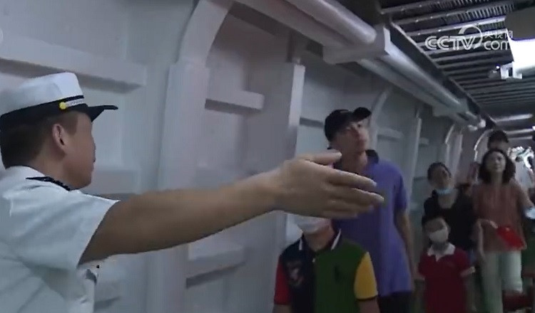 Các binh sĩ Trung Quốc được điều tới Singapore tham gia diễn tập. Ảnh: CCTV-7Sĩ quan Trung Quốc giới thiệu cho một số người dân Singapore về khu trục hạm Yulin. Ảnh: CCTV-7