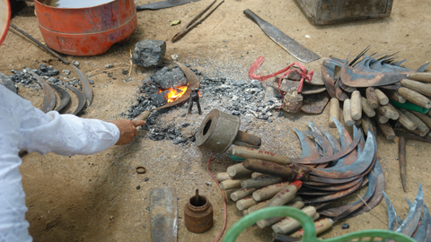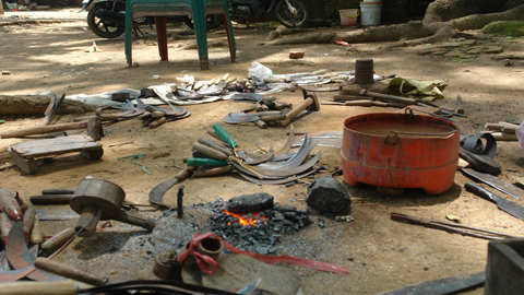 Vợ chồng bác thợ rèn mang đến phiên chợ làng Chóa những dụng cụ để làm liềm, hái cũng hết sức… thủ công. Chiếc bếp bễ mi-ni tự chế chạy bình ắc-quy chúc cái ống thổi gió xuống một cái vục hố khoét dưới đất, chỉ bằng cái… tô đựng canh.