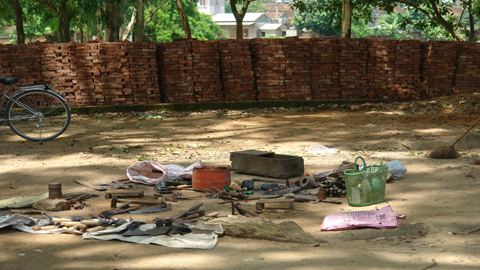 “Lò rèn” được đặt ngoài trời, trên một ô đất trống khoảng 4-5m2, dưới gốc cây xà cừ cổ thụ, trước cổng chợ làng Chóa, và dưới cơ man nào là nắng và gió đồng quê.