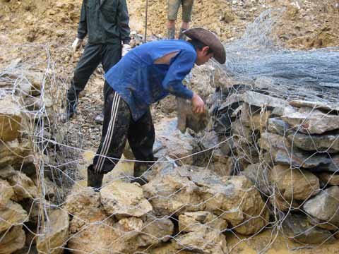 Phía dưới, hàng chục công nhân đang tích cực lấy đá sạt lở tại chỗ để kè bằng rào chắn lưới thép B40.
