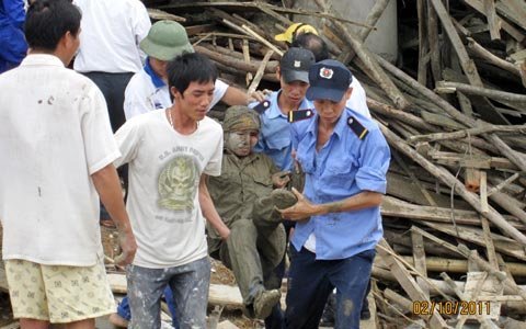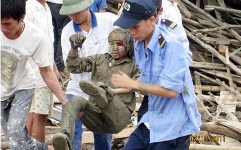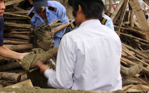 Nạn nhân là chị Lê Thị Mai được đưa ra khỏi đống đổ nát thì đã tử vong. Ảnh: Duy Tuấn