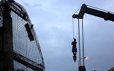 Lúc 18h, nhiều thanh niên đã đu theo máy cẩu để nối vào cột trụ, sau đó cột này sẽ được kéo xuống để tránh nguy hiểm nếu đổ gãy trong lúc mọi người đang đào bới. Ảnh: Duy Tuấn