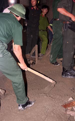 Lực lượng cứu hộ phải dùng cuốc, xẻng để đào bới từng xô bê tông rồi đổ đi một cách khẩn trương. Ảnh: Duy Tuấn