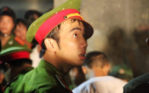 Một chiến sỹ công an ướt đẫm mồ hôi sau khi đào bới. Họ đã làm việc liên tục trong 5 tiếng đồng hồ. Ảnh: Duy Tuấn