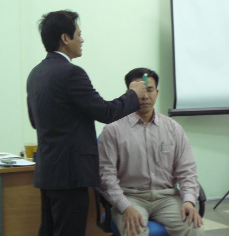 | Thầy giáo hướng dẫn học viên cách hút chiếc bút tự dính vào trán |