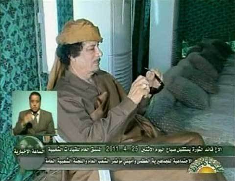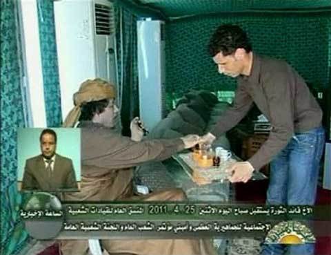 Truyền hình quốc gia Libya đã công bố hình ảnh Gaddafi gặp gỡ mọi người trong lều tại khu Bab al-Aziziyah, ở Tripoli. Đài này cho biết, các bức ảnh được chụp hôm 25/4 sau các vụ không kích của NATO.